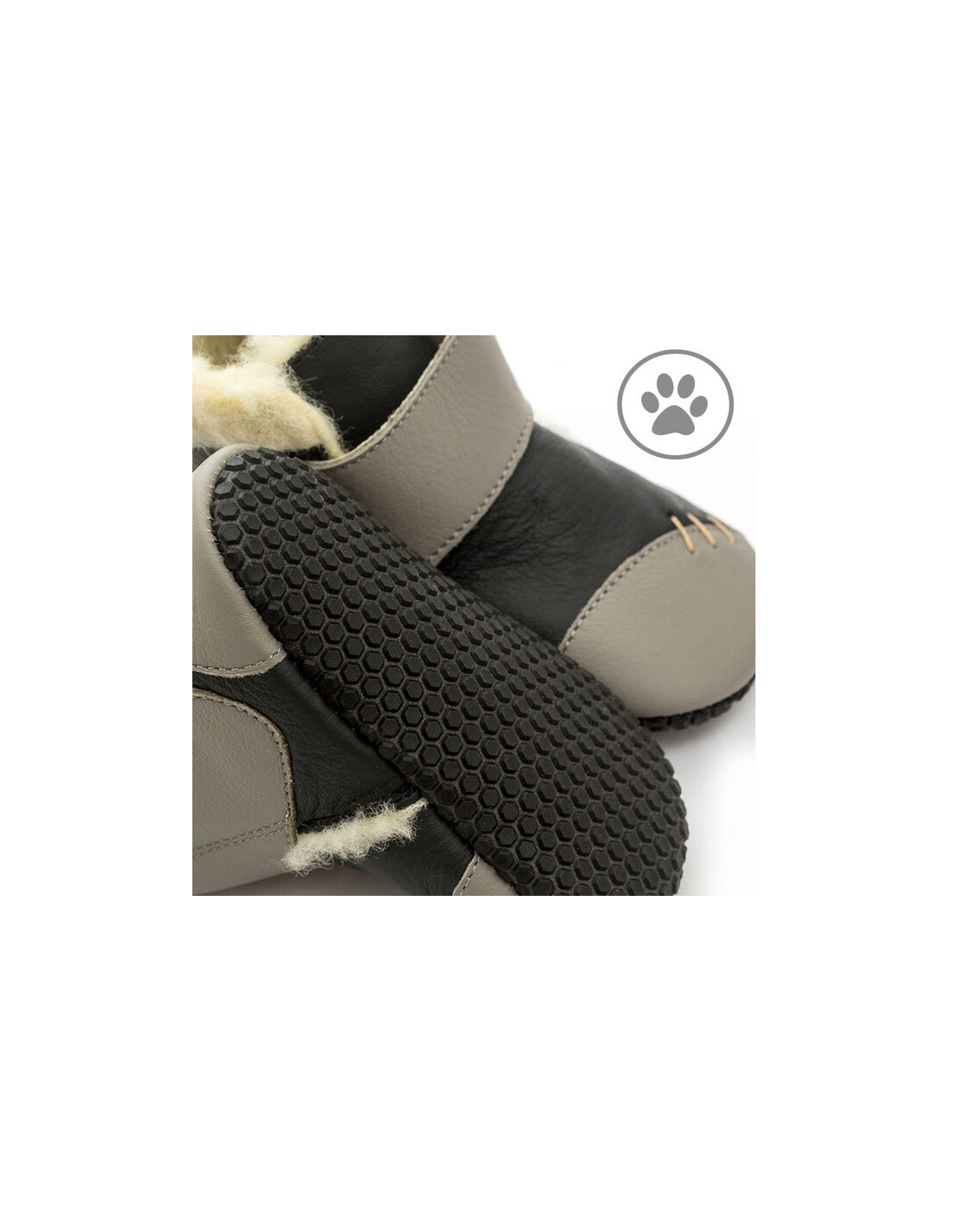 En caso de botines de suela blanda, para elegir el tamaño correcto, mida los pies de su hijo en calcetines gruesos y debido al cálido forro de lana agregue 1-2 mm adicionales al valor medido.