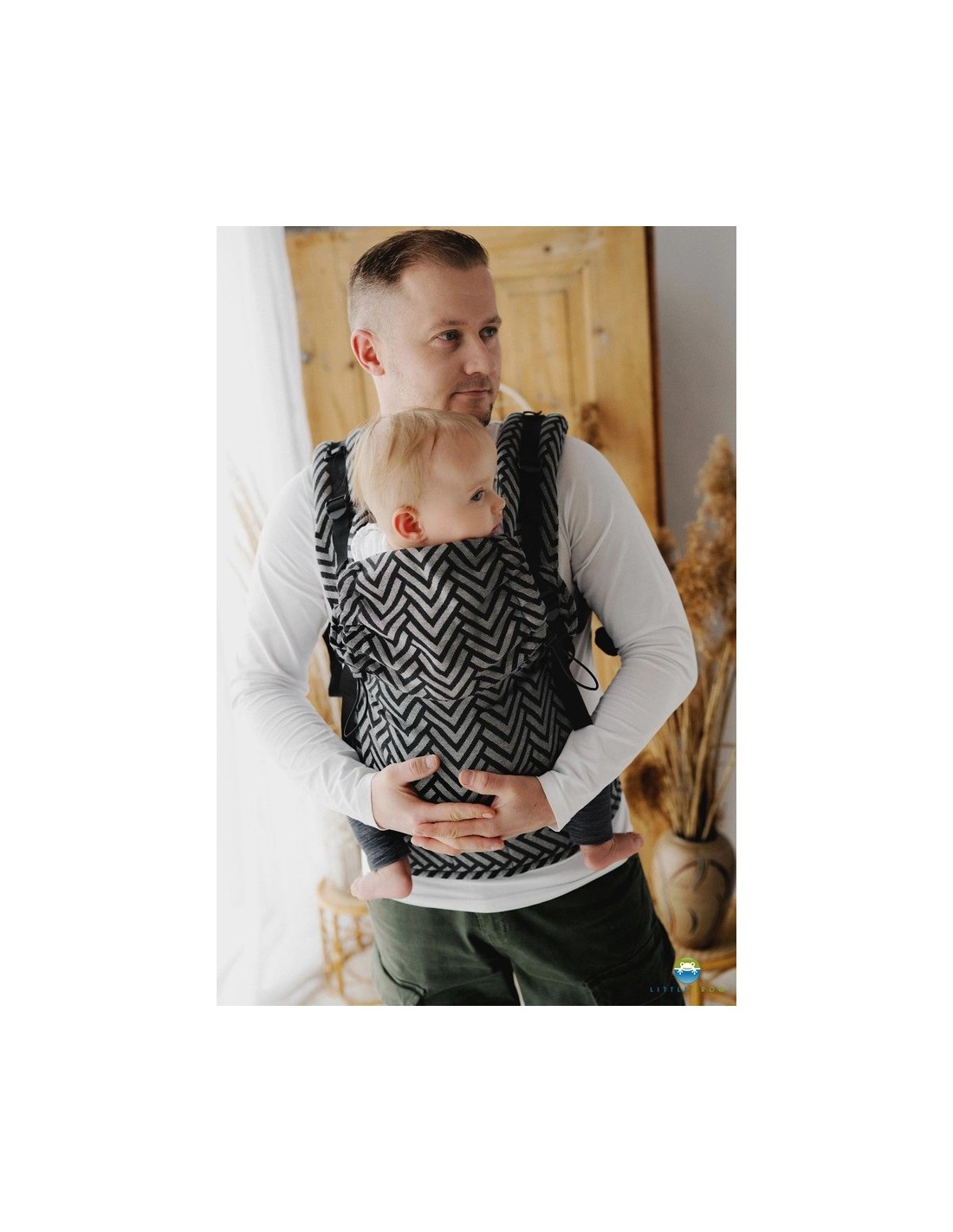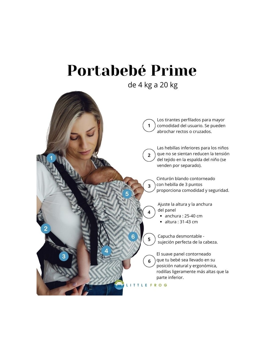 El portabebés Little Frog Prime está diseñado para padres que buscan un portabebés desde los primeros días de vida de su pequeño para llevarlo en una posición saludable, ergonómica y segura. El Prime es un portabebés que crece con tu bebé: puedes ajustarlo y personalizarlo fácilmente, lo que lo hace perfecto como portabebés para recién nacidos y para niños pequeños. El portabebés Prime funcionará perfectamente como portabebés para senderismo o para uso diario. Este es un portabebés suave y ergonómico, sin refuerzos, para que la columna de tu hijo esté correctamente sujeta en todo momento y asuma una posición natural, a la vez que te da la comodidad del porteo. La velocidad y facilidad con la que puedes preparar el portabebés ergonómico para su uso hace que los padres elijan el portabebés Prime para salir con su pequeño a pasear, ir de compras o mientras hacen las tareas del hogar. Todo lo que necesitas hacer es abrochar el cinturón, tumbar a tu pequeño, deslizar el panel, poner las correas, apretar todo y... ¡listo! Tus manos están libres y tu bebé se acurruca de forma segura en ti.